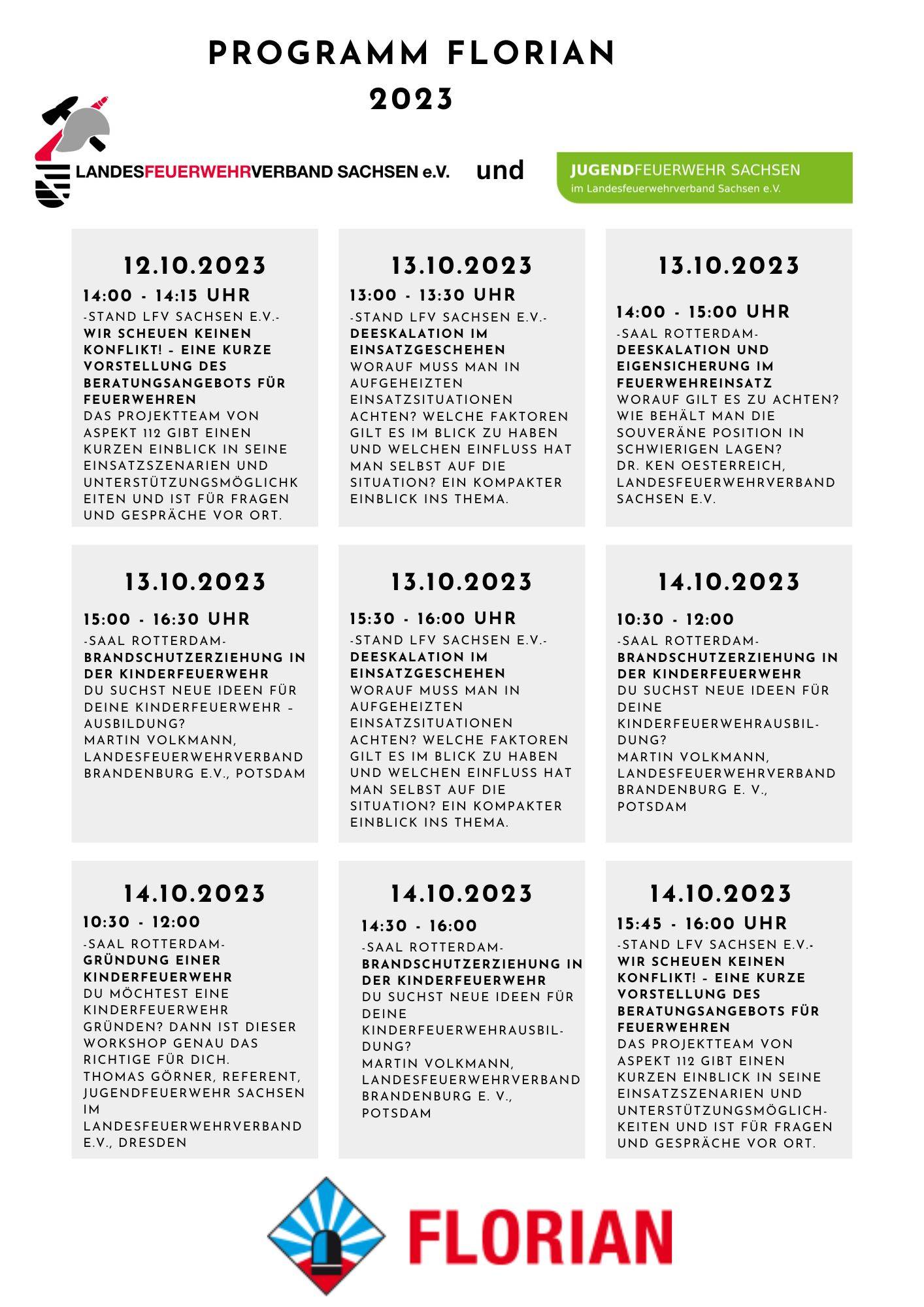 Vom 12. bis 14.10.2023 findet die Messe FLORIAN auf dem Messegelände in Dresden statt. Der LFV Sachsen e.V. ist in Halle 3 Standnummer D 10 zu finden. Das komplette Messeprogramm steht hier als Download zur Verfügung: https://archiv.lfv-sachsen.de/wp-content/uploads/FLORIAN2023_Programm-verschick.pdf
